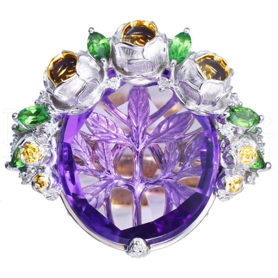 Все цветы коллекции как будто собраны на языческом празднике «Ночь на Ивана Купала».В это время все растения набирают максимальную силу. Насыщенный цвет аметистов символизирует летнюю ночь, а бутон цветка словно окружает пряный аромат.